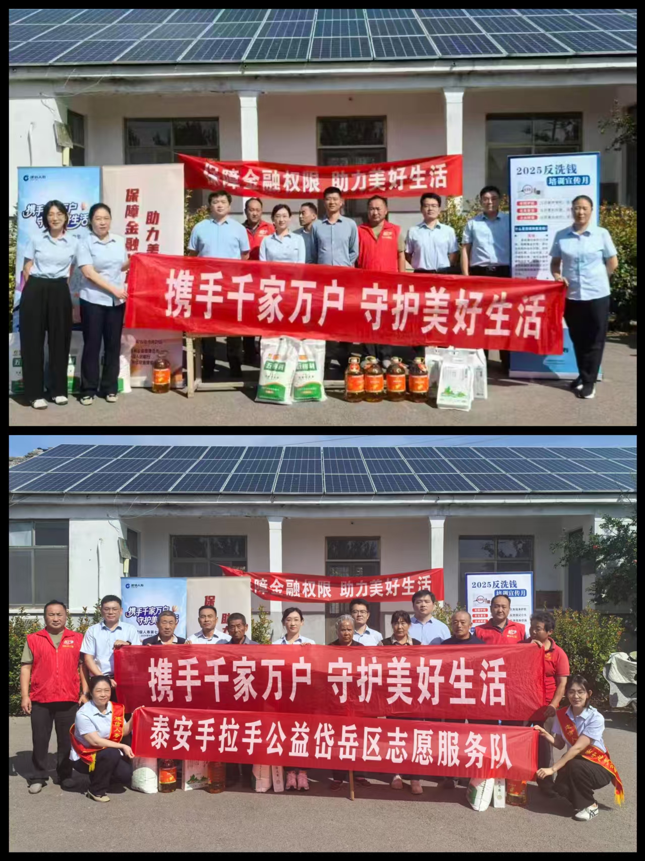 泰安中支与手拉手公益协同,精准摸排,针对低收入家庭、留守老人等群体,发放米、面、油等生活物资,解决基本生活难题。同时,向村民讲解防范金融诈骗、反洗钱等知识,现场设置展示台,针对老年人、乡村居民重点普及“防范电信诈骗”“识别非法集资”“正确使用银行卡”等内容,并现场解答村民疑问。